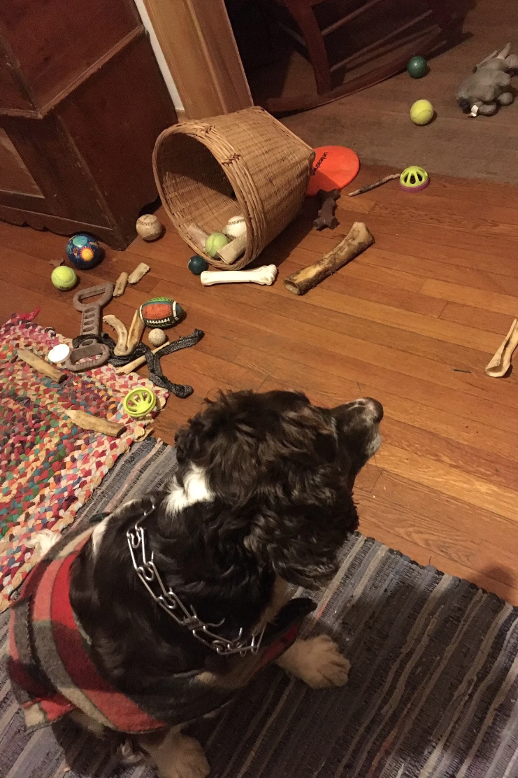 TBone scratches the floor, woofs at his overflowing basket of possessions like it is alive, menacing him. Till I help him up-end it, overturn most of it on the floor, where he rifles and digs, sniffs each treasure he has collected since he arrived here, a little over four years ago. Discards several tennis balls, a giant bone like a dinosaurs shin, three broken plastic vitamin D bottles, a stuffed squirrel whose stuffing he has removed painstakingly via its tiny rectum, half a plastic bell, a squeezy bone that squeaks when you bite it.