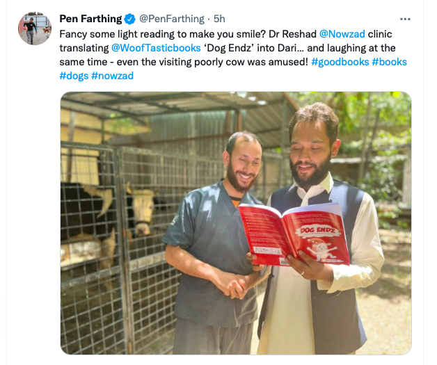 When I saw this photo on Pen Farthing’s Twitter page I got such a buzz. The power of books and humour and dogs—to cross borders and unite people …So happy to bring a smile to the faces of these two veterinary staff at the Nowzad clinic in Kabul, Afghanistan.