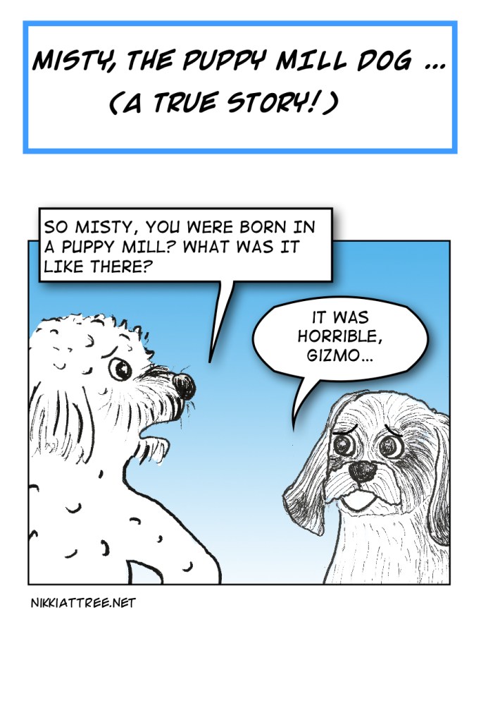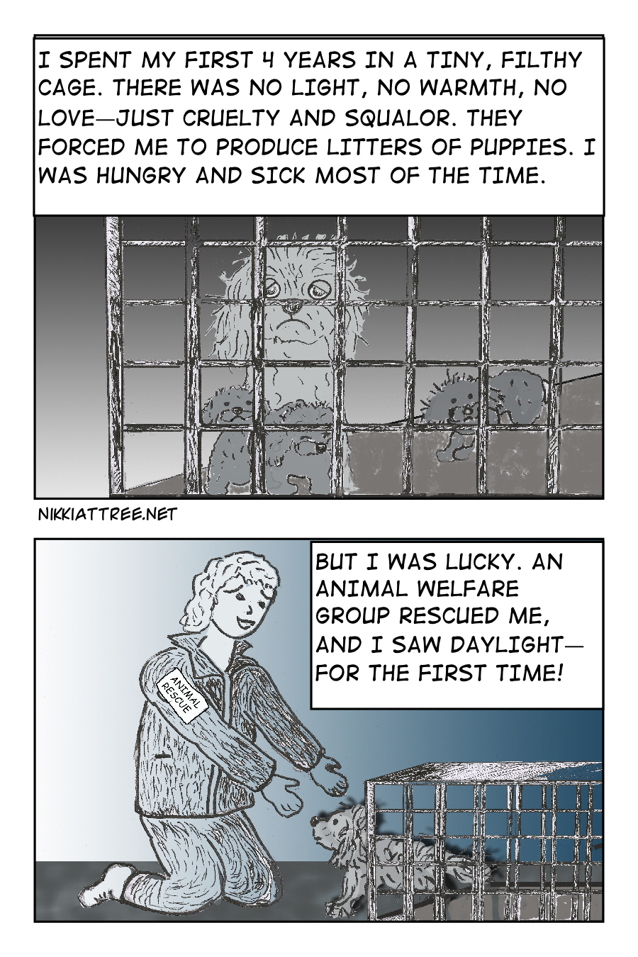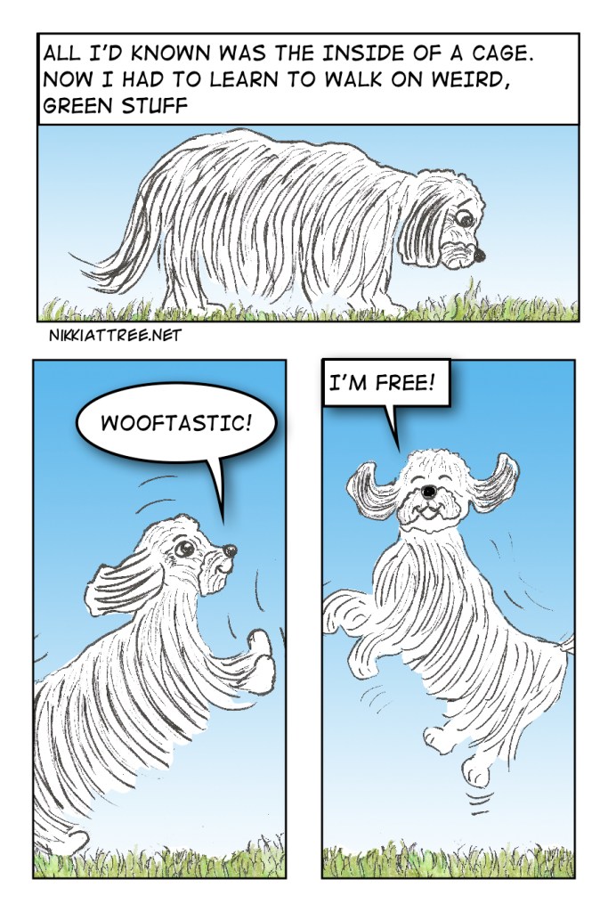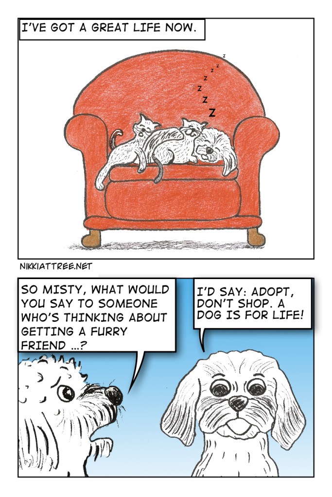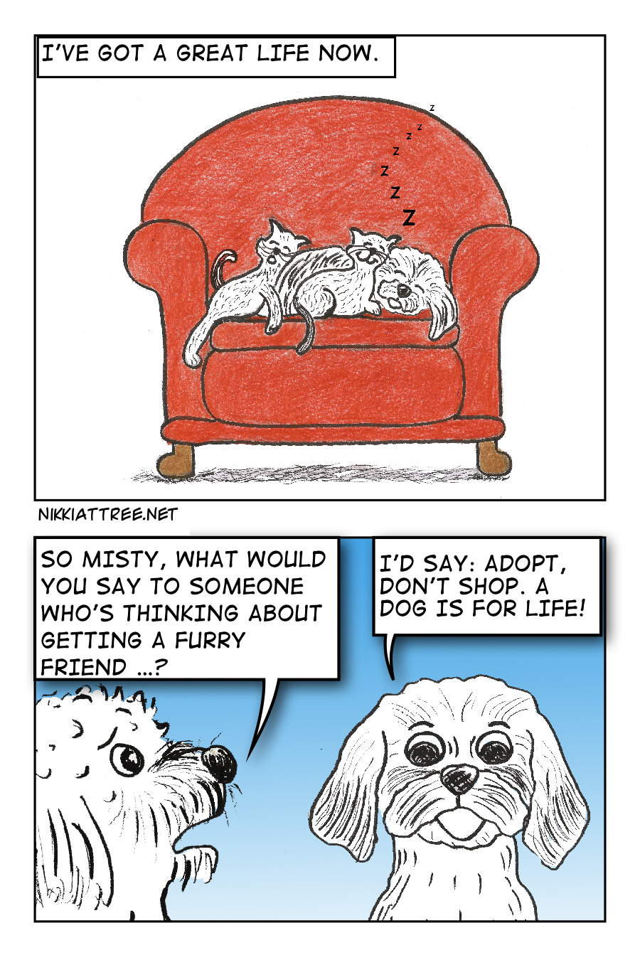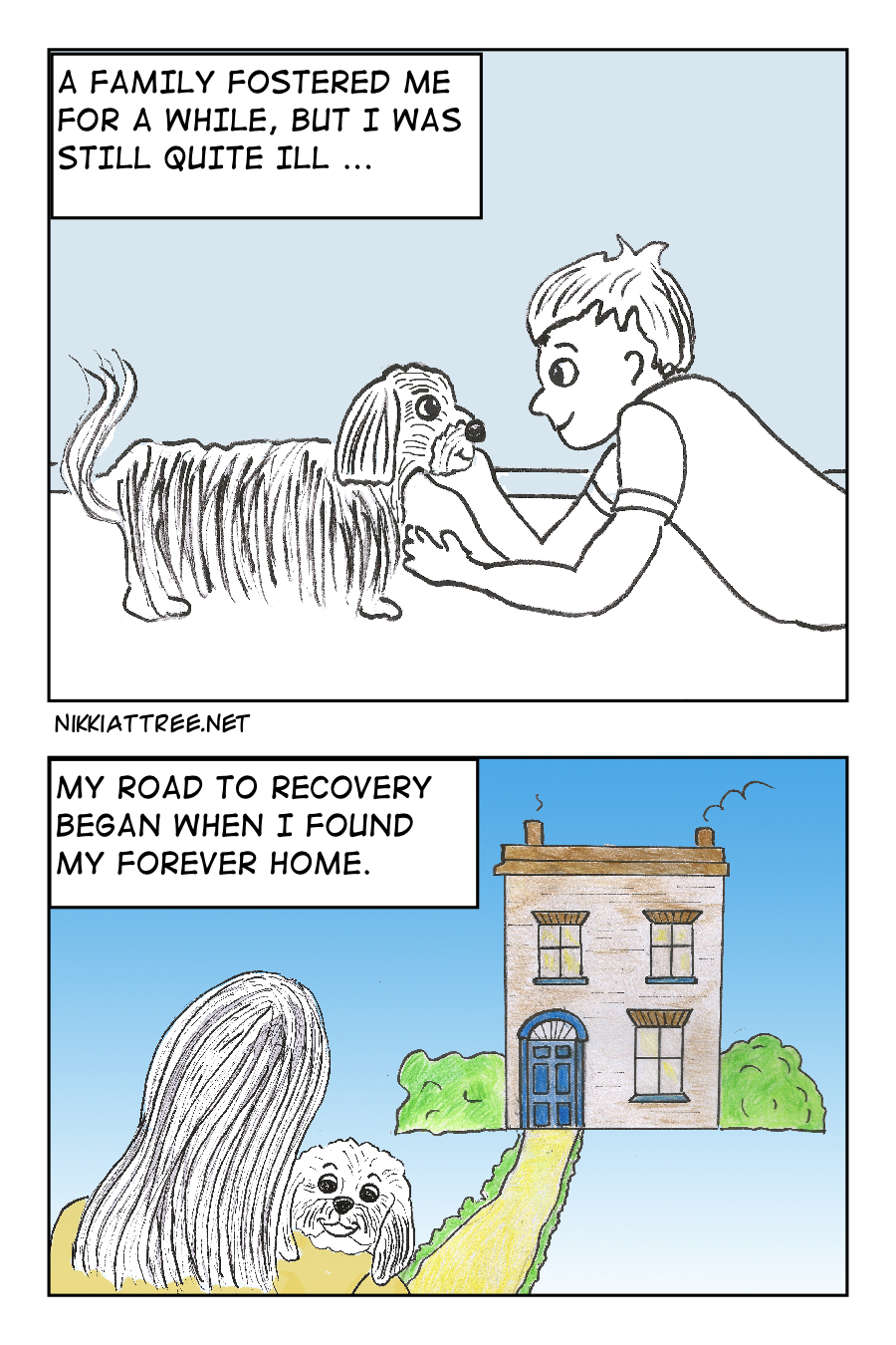 A lot of my artwork has been about dogs and promoting the message adopt don’t shop. During the pandemic, I produced a cartoon book ´Dog Endz – A collection of wooftastic cartoons´one of the cartoons was based on a true story about Misty, an ex puppy mill dog.